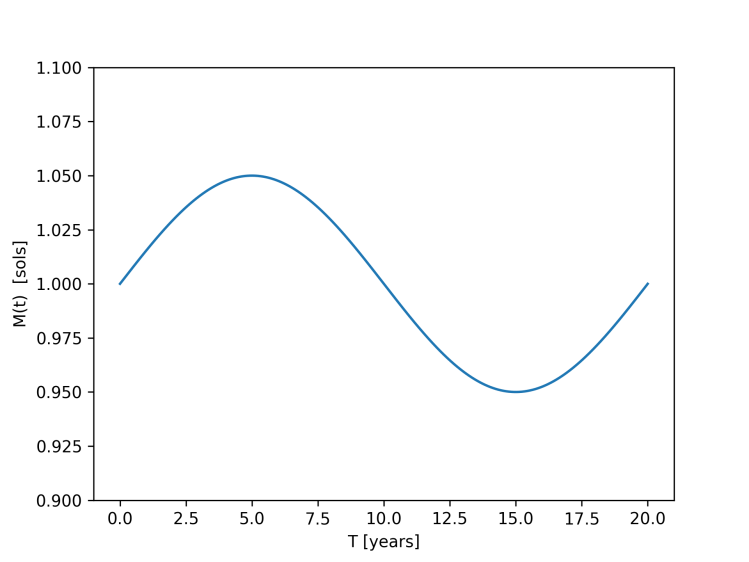 . It’s worth saying at the offset that this situation is highly unphysical. While it’s certainly the case that stars can lose mass over time (as happens during the RGB and AGB phases of stellar evolution) or gain mass (as may happen during stellar formation). These processes tend to be monotonic – either decreasing or increasing the mass of the star in a consistent way. It’s extremely difficult to propose a physical process that results in the mass of the star oscillating in the way we model. Therefore this effect is more of a mathematical curiosity than relevant to a real physical system. That said, the relative simplicity of the system lets it serve as a nice example of resonant phenomena more broadly.